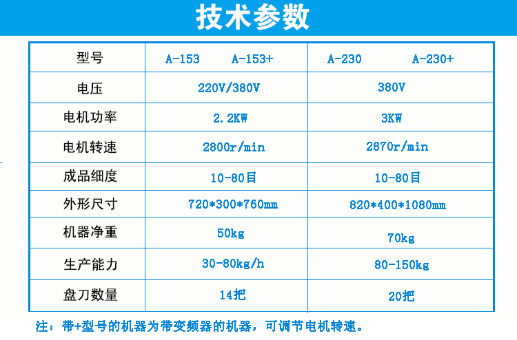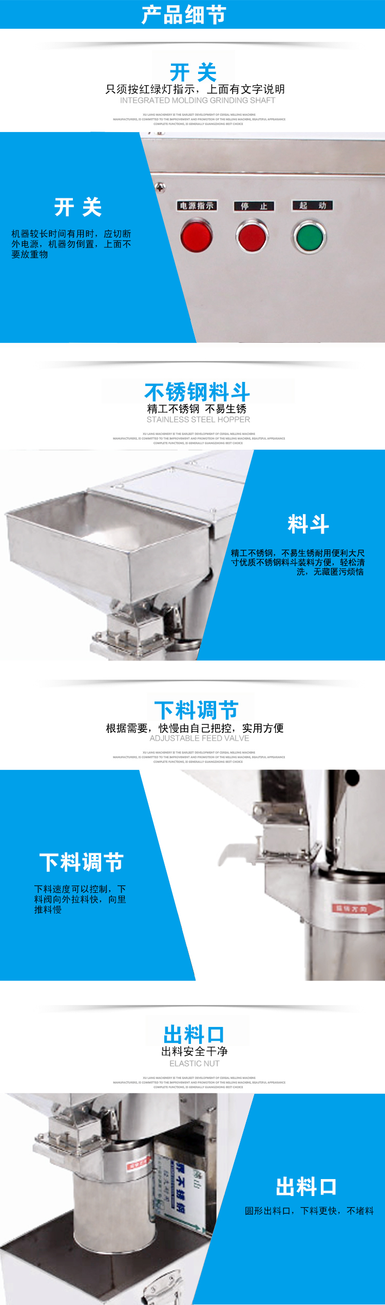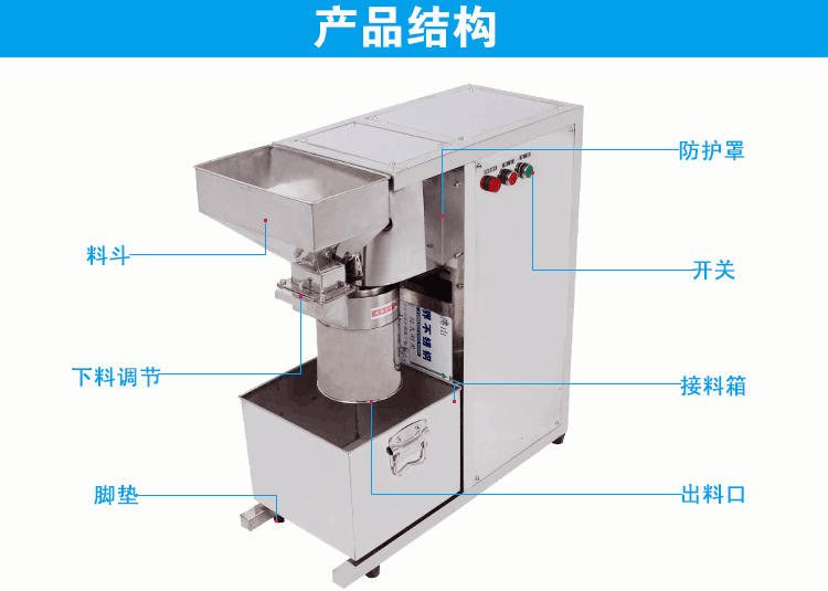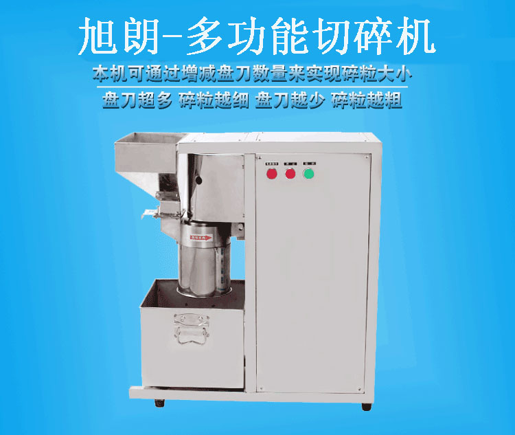 2、本公司根据客户需求,针对油性物料在粉碎过程中易出油的特点,经过多年研发、反复实验、不断改进与提升,从 3、多功能切碎机采用高速钢刀片的形式对物料进行高速切碎,因接触面小而速度快,从而达到不出油的效果。 4、整机为全不锈钢制造,耐磨,耐用,符合食品加工标准,电机采用半封闭式安装,防尘,防烫手,卫生美观,而且 适用范围: 加工范围: 1、瓜子仁,芝麻,杏仁,红枣,花生,核桃,白糖,蒜头,姜,马铃薯,辣椒,洋葱,莲藕等等。 2、芝麻、红枣可粉碎成均匀粉末。芝麻,建议在高温(200℃以上)状态下短时间爆炒3-5分钟,粉碎效果更佳。 3、含油量高、含水量较高的物料,只能打成泥状,细切状或颗粒状。 4、干些物料,要求炒干、炒熟后,再用本机加工,效果更好,切碎得更细,产量也更高。 使用说明: 2、安装时注意刀片的刃口方面与电机转向保持一致; 3、若生产量不大,细度要求高,可加筛网加工,每装四把刀片后加一片筛网,总共可装2片筛网;也可以只装一片 4、量大而细度要求不高时无需加筛网; 5、在加工核桃,洋葱,蒜头,姜,油性重或料径大的物料时可调大刀与刀的间距,减少用刀数量。 6、进料粒度宜在15毫米以内,较大块物料,应先行破碎或切碎。 7、拆除筛网后,本机的产量会加快。如一遍的细度不够,可以粉碎两遍甚至三遍。 保养事项: 2、定期检查机器的电机,电路,皮带,螺丝,如发现松动、磨损应及时加固或更换; 3、每次加工完成后需清理机器,刀片可拆下水洗或干布擦拭干净晾干后再安装,可涂上食用油保护。 4、刀片用钝后可以用油石研磨。 注意事项: 2、开机前检查电压、转向是否与本机要求相符。 3、本机在操作过程中,应随时有专人看管,如发现机器卡机、异响等情况,应马上关机,断开电源,检查机器,排除 4、使用机器完毕后,请务必切断电源。 5、电源切断后,才可以对机器进行拆装和清洗,拆洗时注意刀具等锋利部位,以防割伤。 6、本机仅适合切碎脆性物料,客户在使用过程中,应确保物料里面不得含有金属、石块等硬度大的异物,否则易损坏
