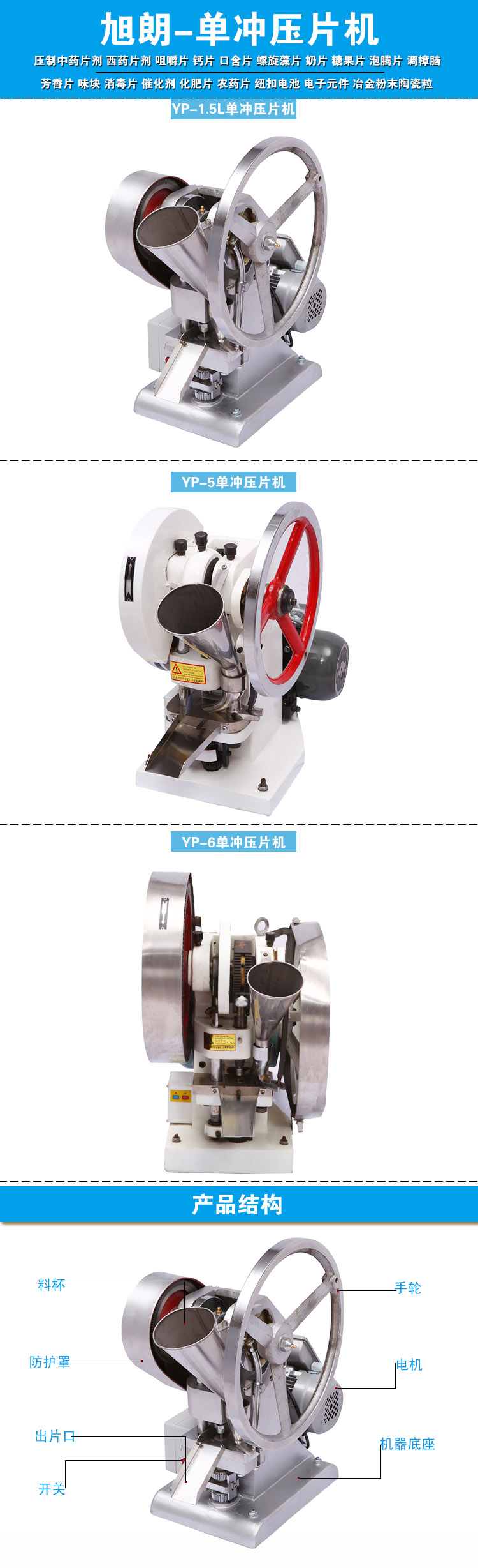 各种形状的模具。  单冲压片机能将粉粒状原料压制成片剂,可广泛适用于制药厂、化工厂、医院、科研单位、实验