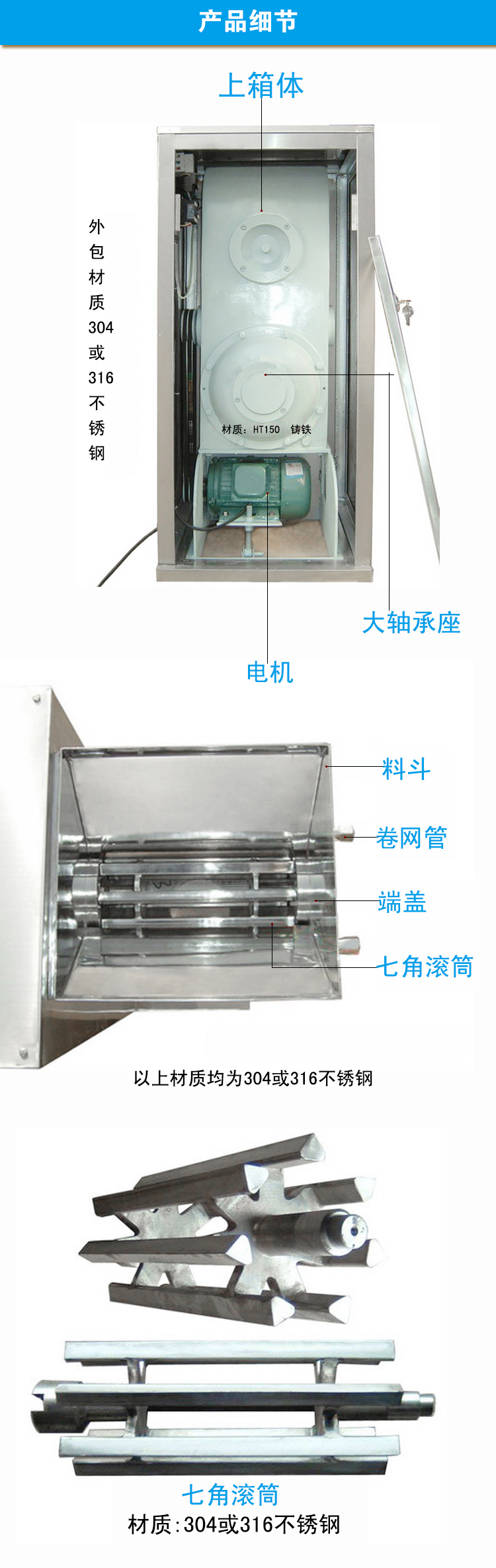 该机可将混合的粉末状物料制成颗粒,也可将块状的干料粉碎成所需的颗粒。适用于制药、化工、食品、科研