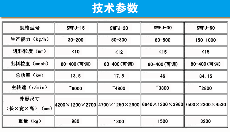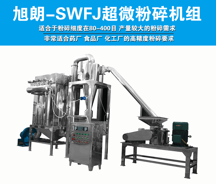广州安博官方网站生产的SWFJ-15/20/30/60型超微粉碎机组主要适合于粉碎细度在80-400目、产量较大的粉碎 需求,非常适合药厂、食品厂、化工厂的高精度粉碎要求,粉碎细度可随意调节。 该粉碎机组主要由主机、辅机、电控箱三个部分组成,设计紧凑,结构合理,属风选式、无筛网。超微粉碎